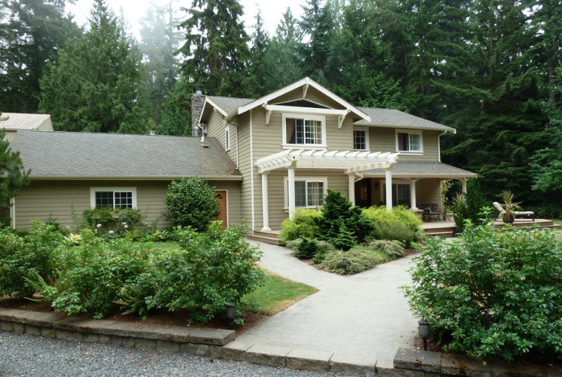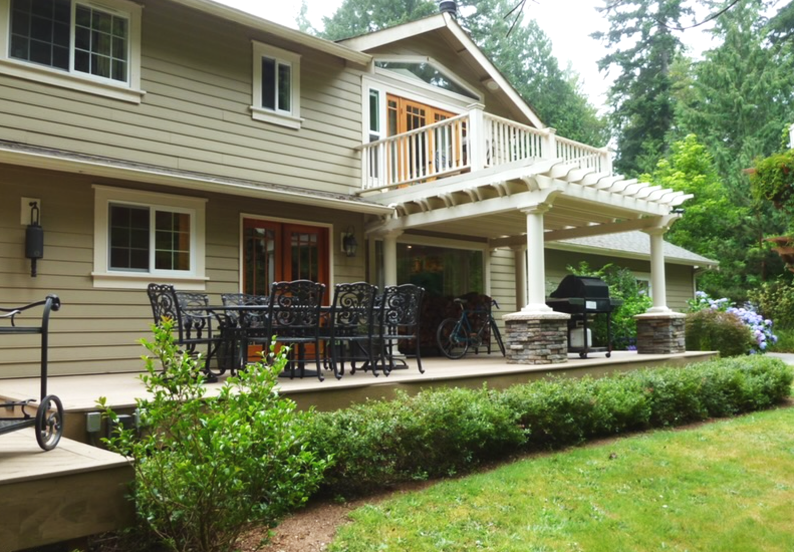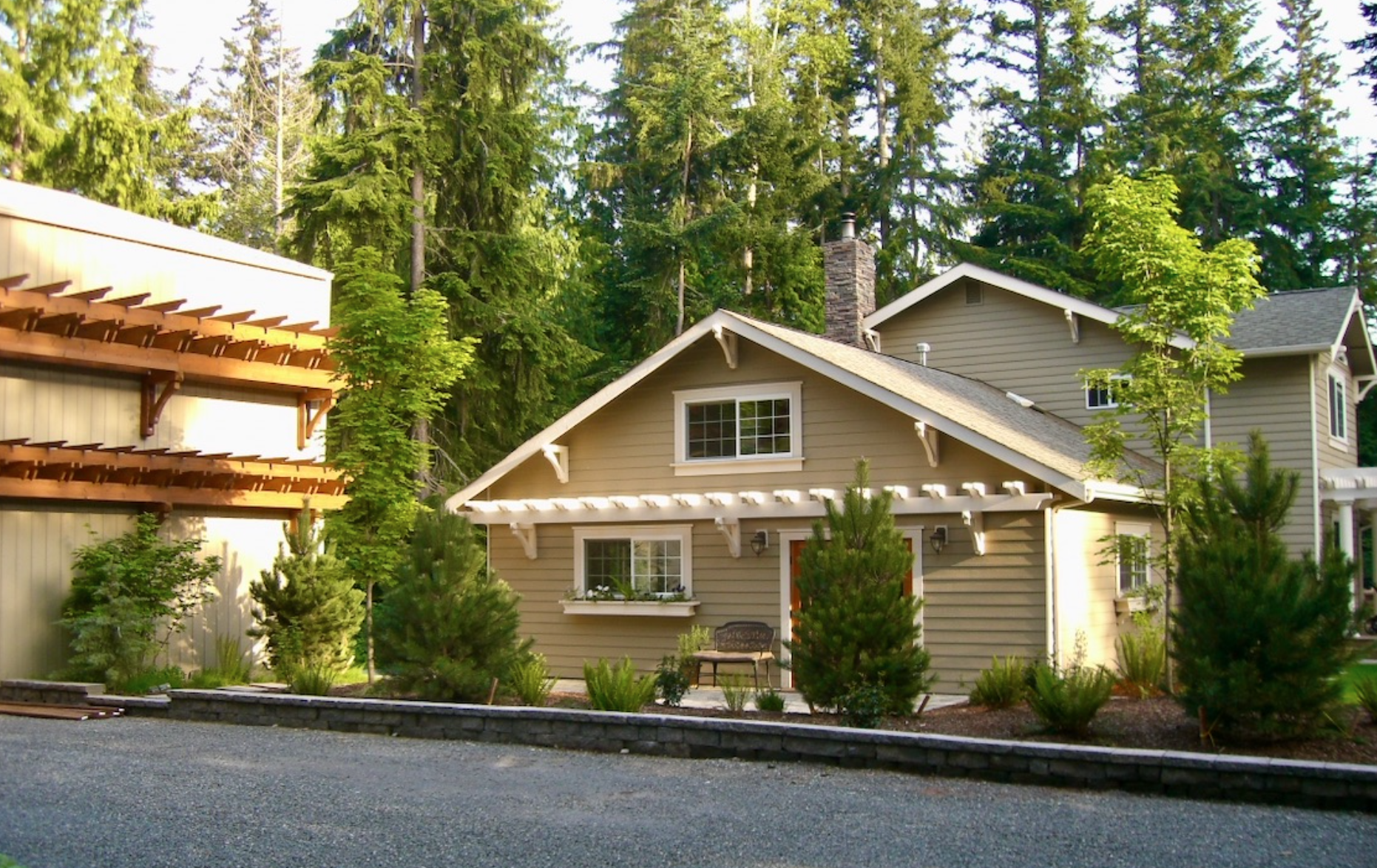Additions like pergolas, stonework, white columns, and an expanded deck helped bring structure and balance to the home, while the guest cottage was redesigned to feel cohesive with the main residence.